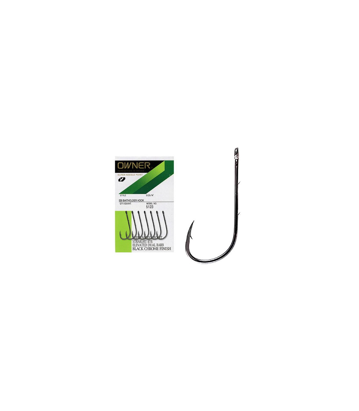 Anzuelo Owner Ebi Baithoolder del número 6 con pata recta y acabado cromado negro anticorrosión.