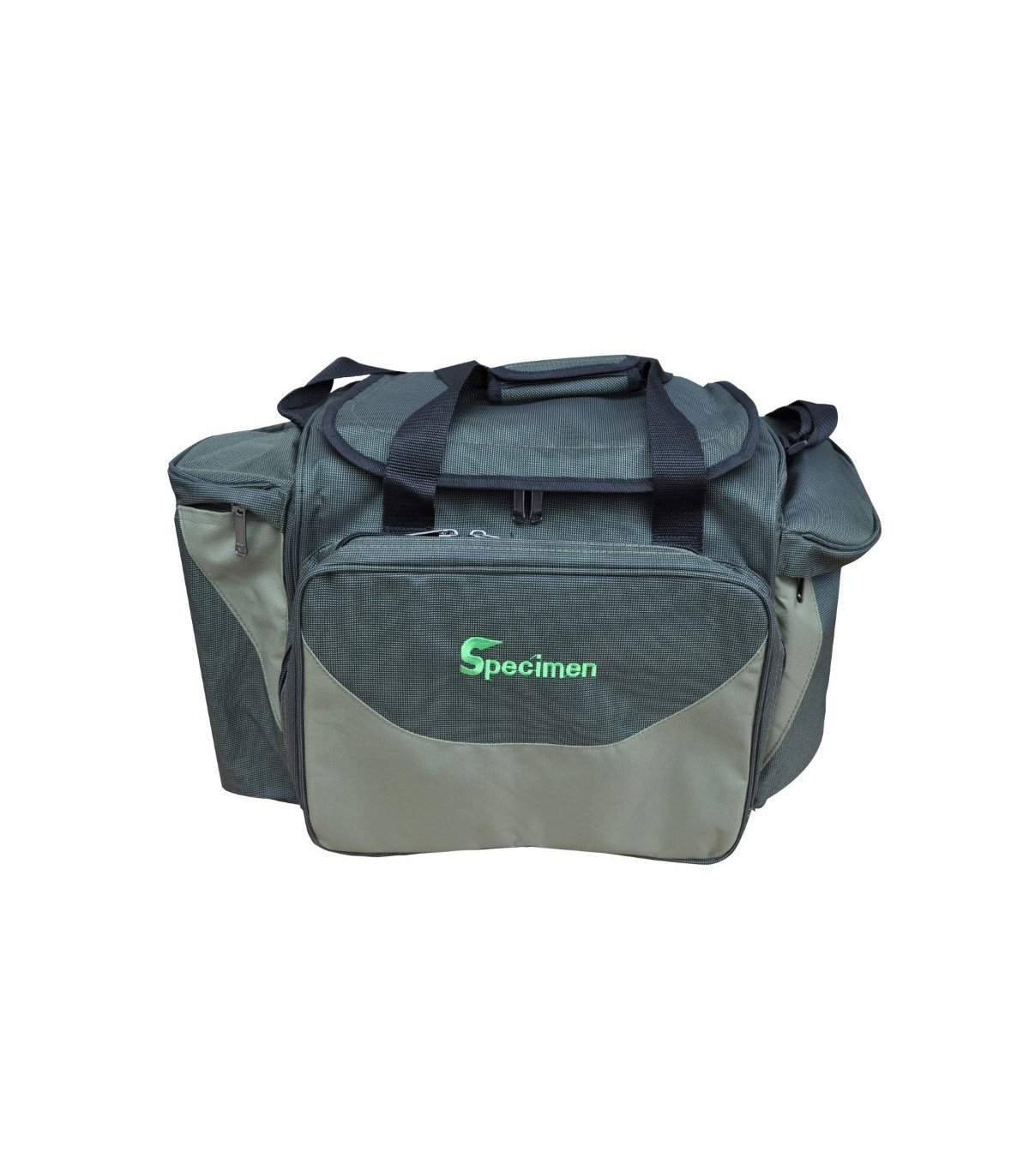Bolso Specimen Carryall en color verde con doble cremallera y correa y asa para transporte de material de carpfishing.