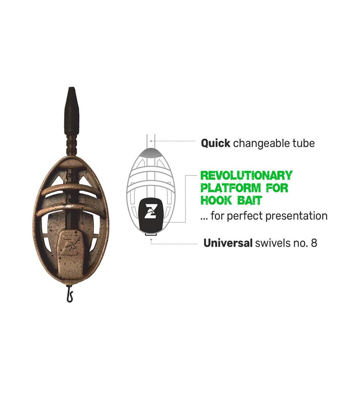 ZFISH Method Feeder ZFX son los mejores y más sofisticados alimentadores de método de «NUEVA GENERACIÓN» de la serie premium «3Fish». Un equipo de nuestros especialistas participó en el desarrollo de estos sofisticados alimentadores y están realmente pensados hasta el último detalle. Los cebadores tienen el tamaño perfecto y están perfectamente equilibrados, por lo que lanzan bien y siempre aterrizan en el fondo del lado correcto. Una nueva característica revolucionaria de estos alimentadores es un puente/superficie especial para colocar el cebo con anzuelo, que garantiza que su cebo siempre estará exactamente donde debe estar. Una gran ventaja del alimentador es la posibilidad de cambiar la carga fácil y rápidamente. Esto es posible gracias al tubo extraíble y a la sección transversal en la parte posterior del alimentador. Tras extraer el tubo del cuerpo del alimentador, basta con retirar el sedal y sustituir el peso por otro. Tal variabilidad le dará la posibilidad de adaptarse a diferentes condiciones durante la pesca, sin necesidad de volver a atar tediosamente el montaje final. Los comederos están fabricados en un color marrón apagado con puntos negros, por lo que se mimetizan fácilmente con el fondo y no molestarán tanto a los peces que rodean la zona de alimentación. Por supuesto, también se incluye un eslabón giratorio universal QC de tamaño 8 para cambiar fácilmente el aparejo final.